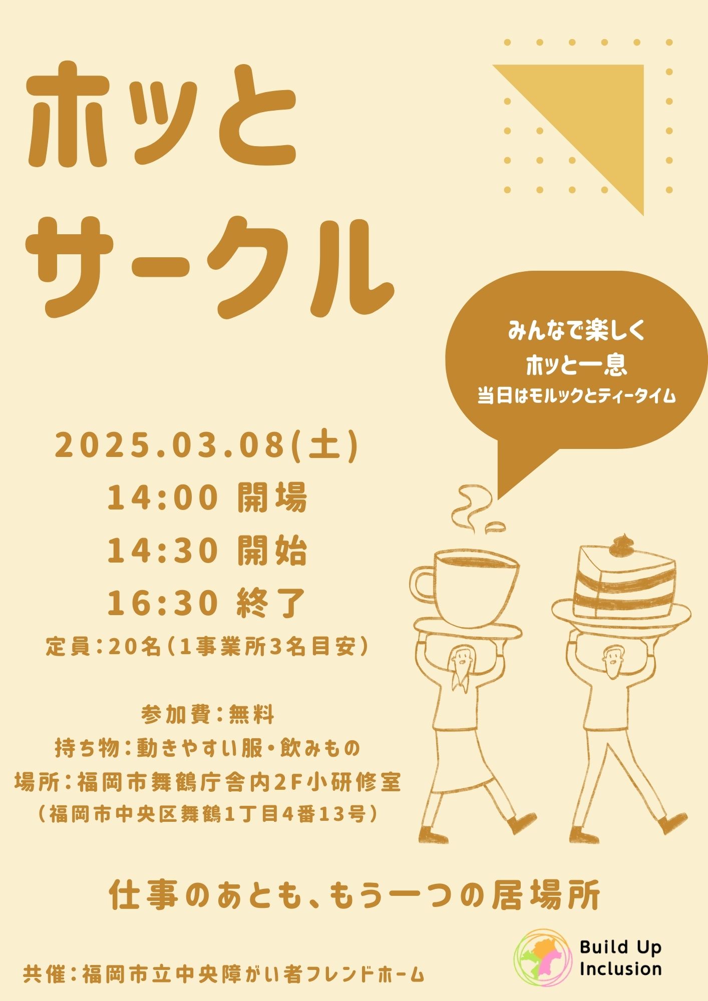 Build Up Inclusion FUKUOKA は、福岡市立中央障がい者フレンドホームとの共催により、障がいのある方々が就職後も安心してつながれる場「ホッとサークル」を、2025年3月8日(土)に福岡市舞鶴庁舎内にて初開催いたします。